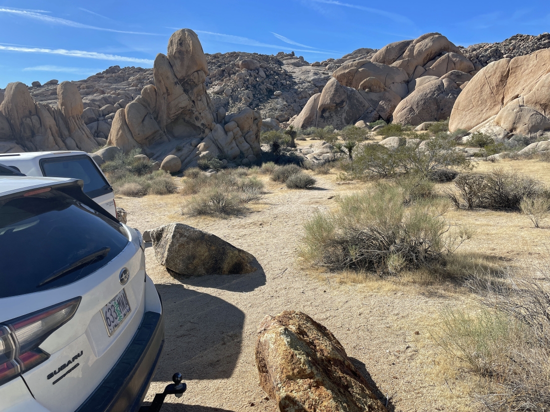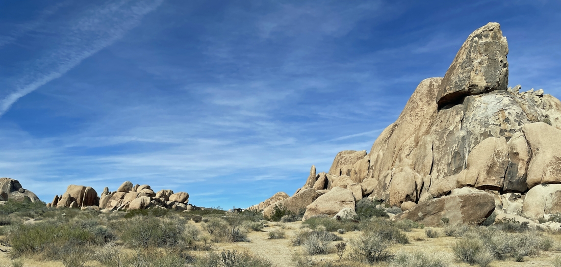 From the intersection of Park Blvd and Pinto Basin Road in Joshua Tree National Park... drive south on Pinto Basin Road for 3.1 miles and turn right onto the dirt Stirrup Tank Road... then drive Stirrup Tank Road for 1.4 miles to the end of the road... we will be hiking up the smooth rock out there in the middle of the photo.