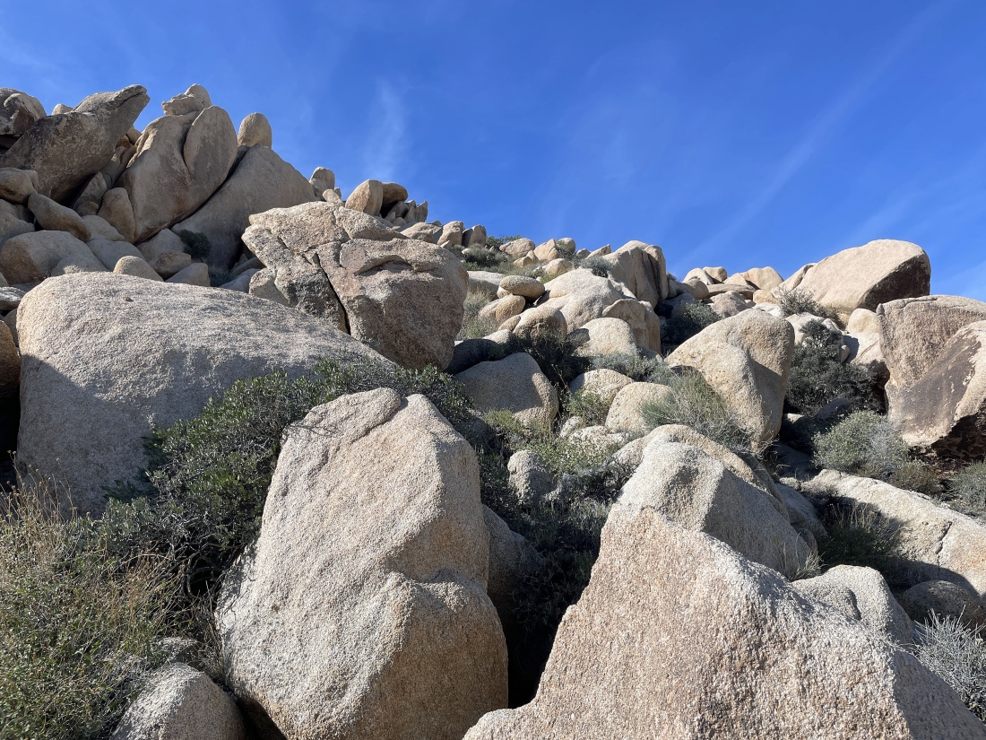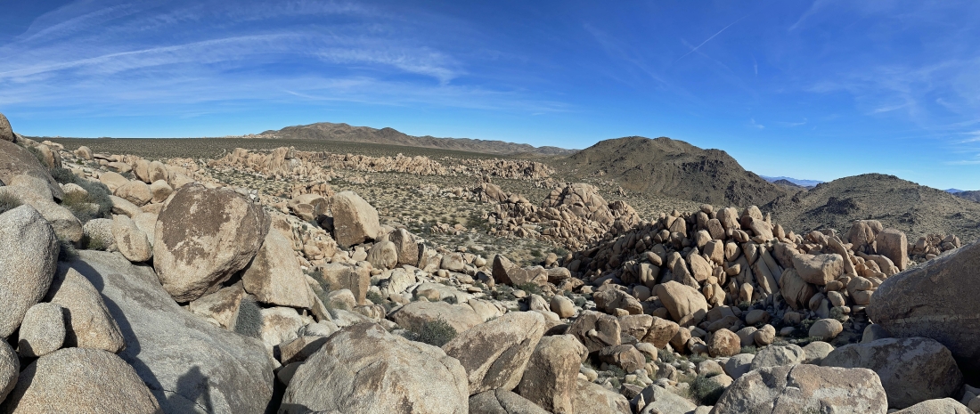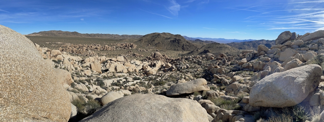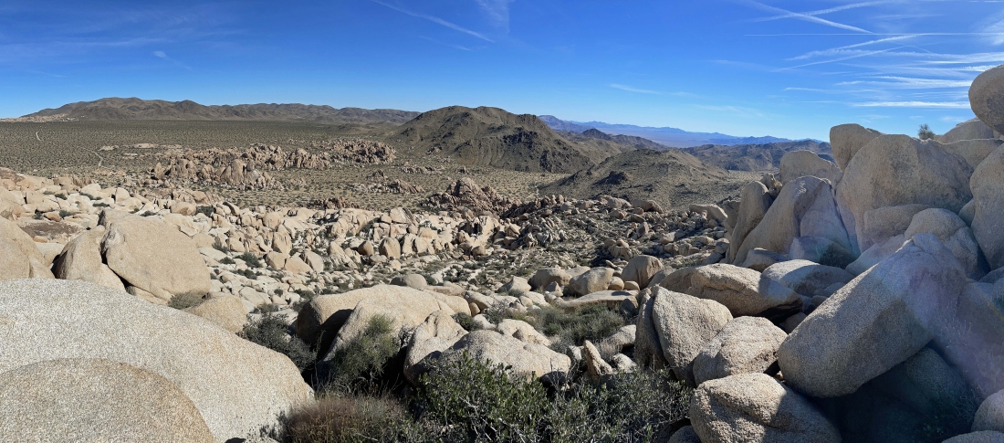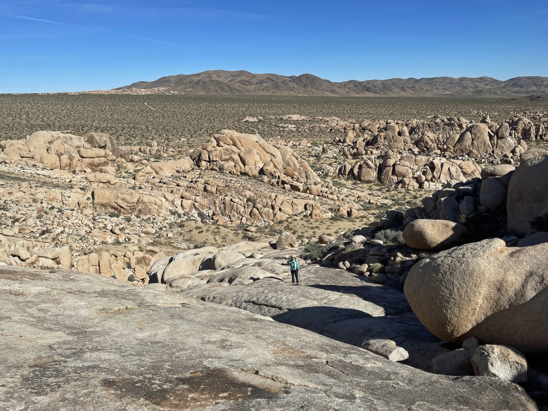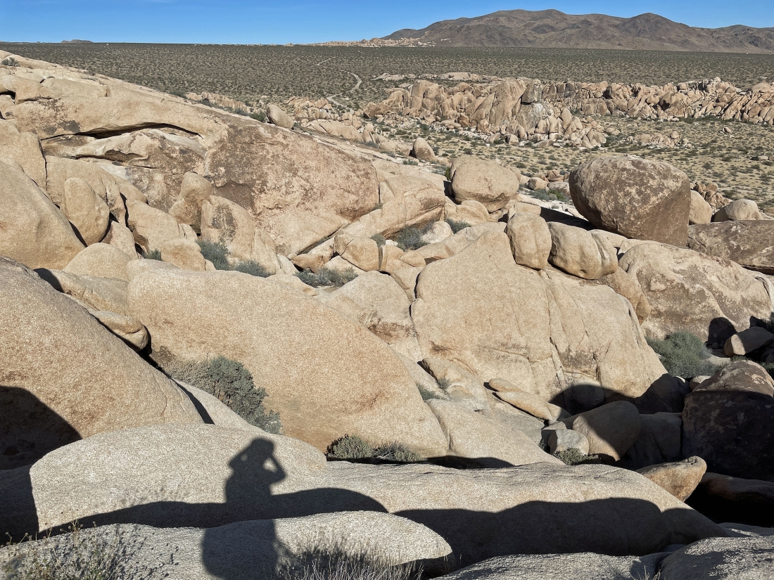 Standing on Point 3819 and trying to figure out a way down through the boulders to the desert floor... Point 3854 is the huge mountain in the foreground... with the Pinto Mountains on the horizon.