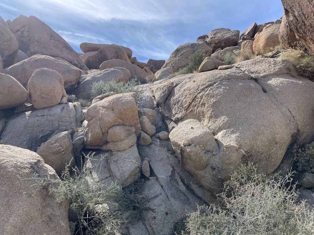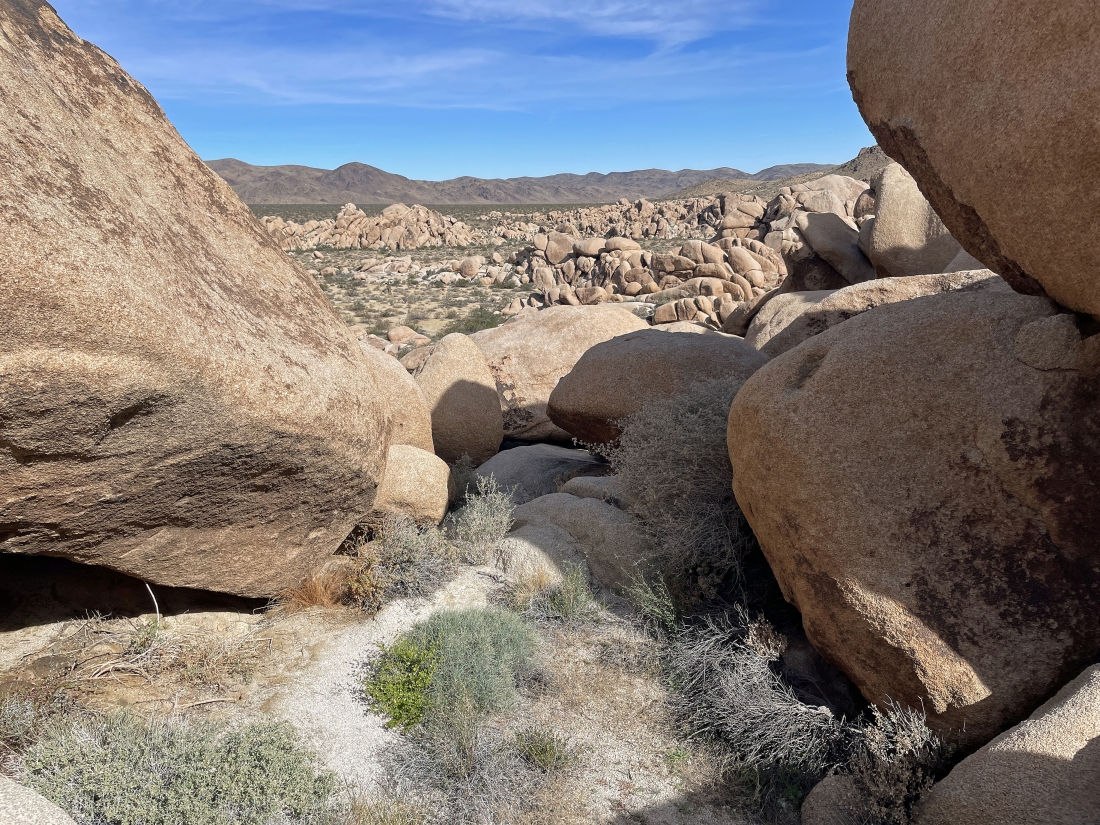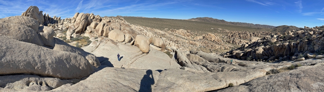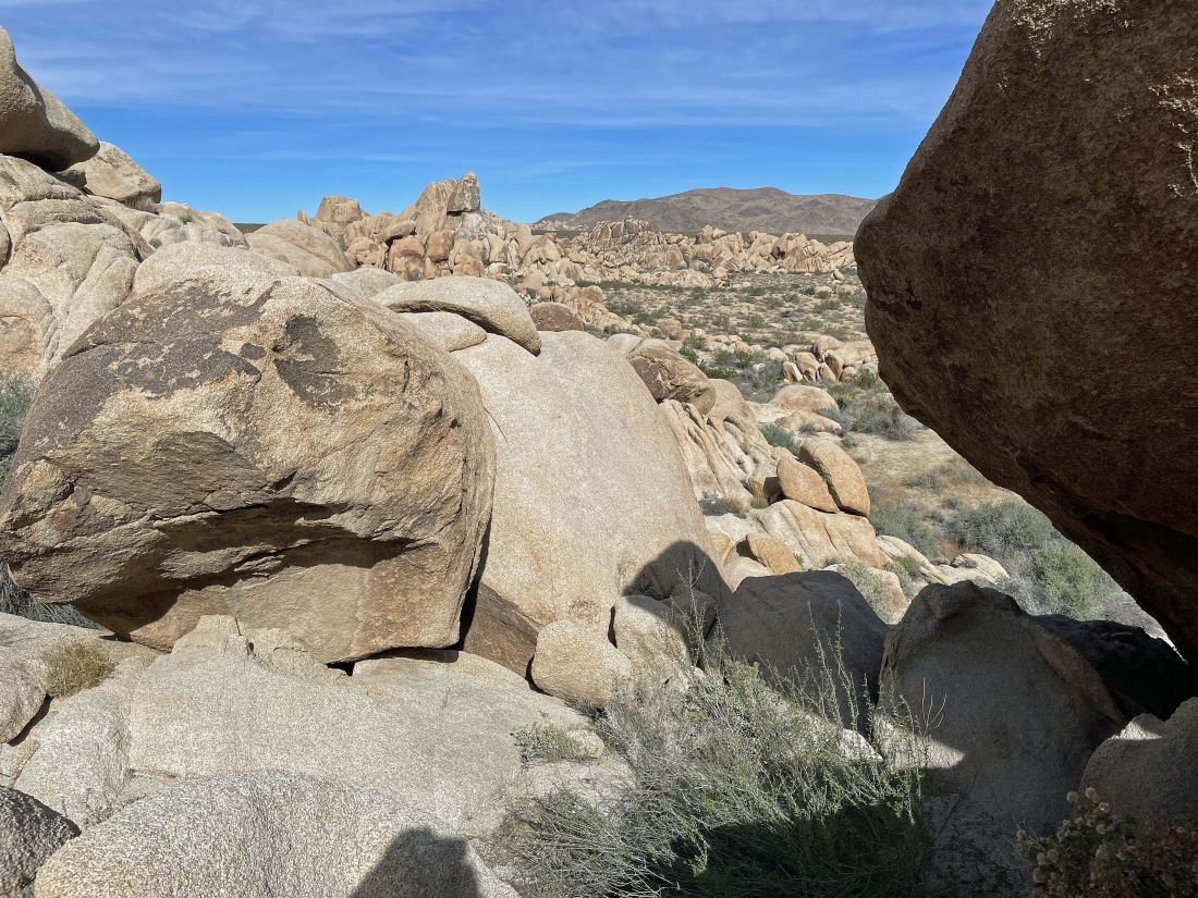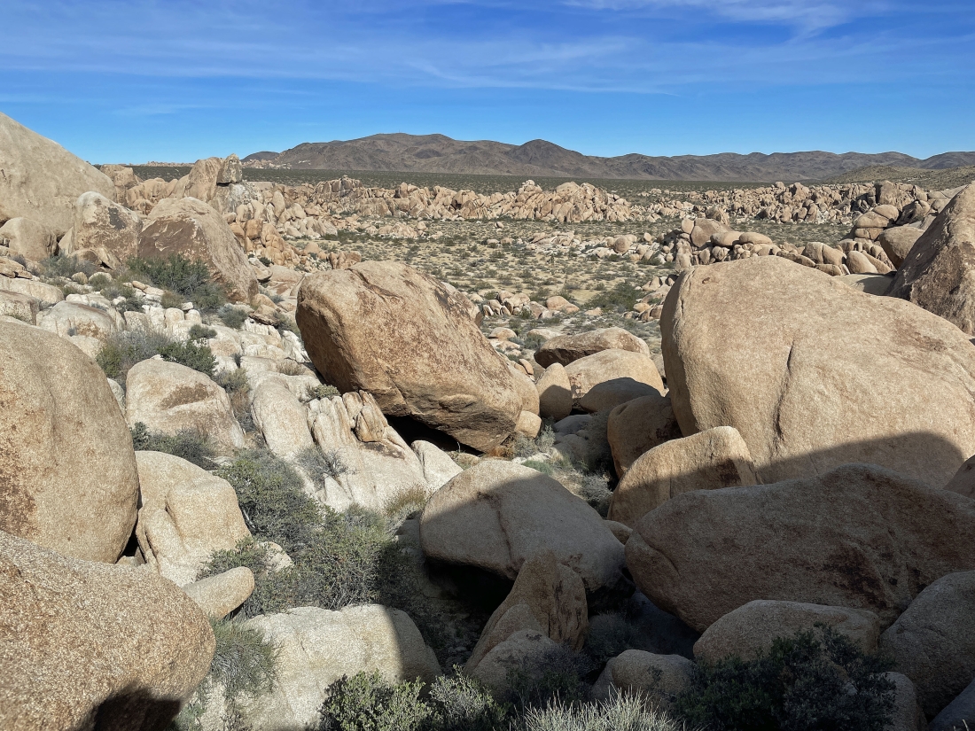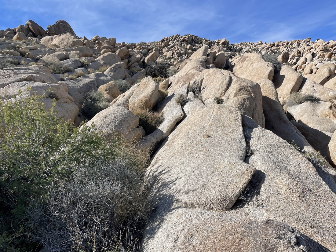 Standing on Point 3819 and trying to figure out a way down through the boulders to the desert floor... Point 3854 is the huge mountain in the foreground... with the Pinto Mountains on the horizon.