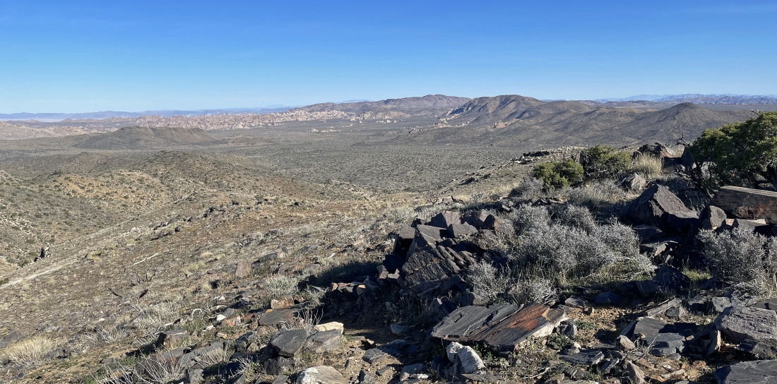 Looking NE across Lost Horse Valley to Ryan Mountain and Queen Mountain on the right-center horizon... with the Wonderland of Rocks in the left foreground.