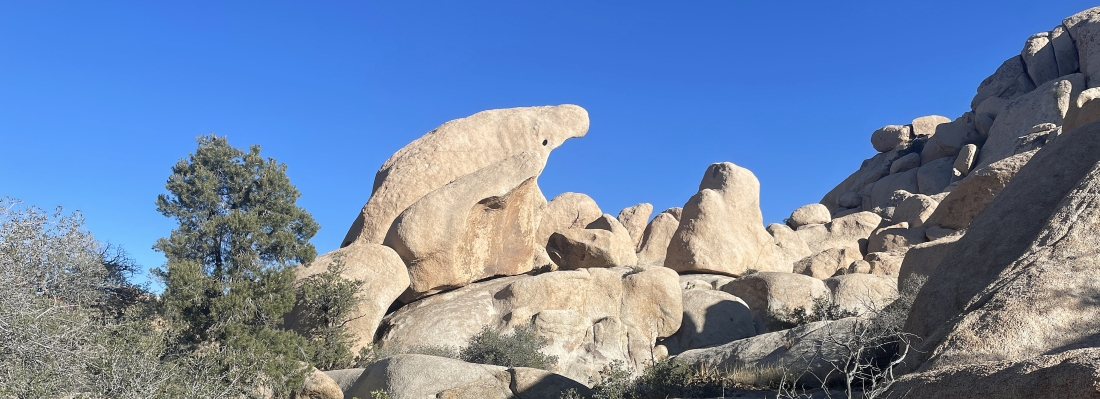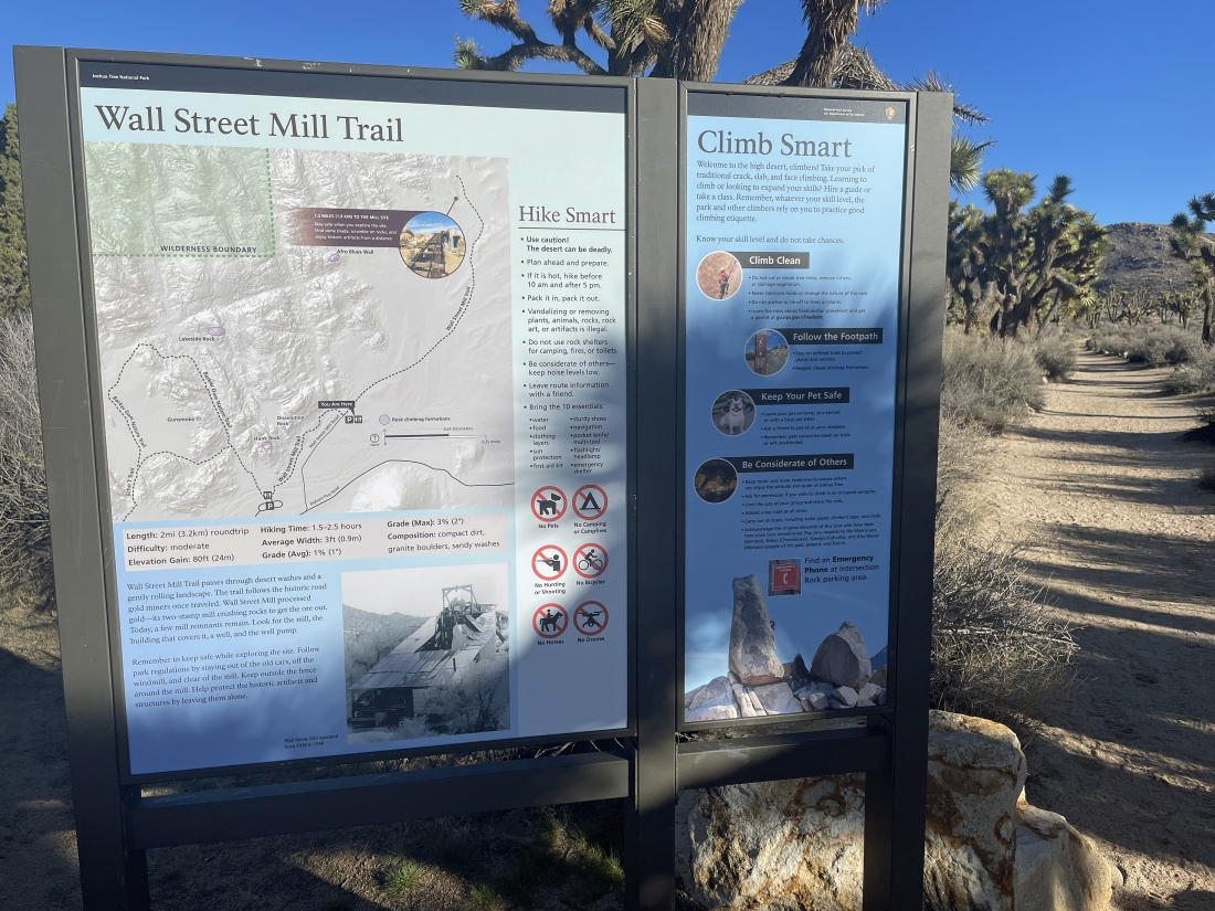 We parked in a dirt parking lot located a quarter mile NE of the very popular paved parking lot for Barker Dam and started hiking NE on the Wall Street Mill Trail. The dirt parking lot is also used for overflow parking for the very popular Barker Dam hike.