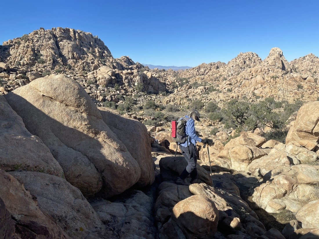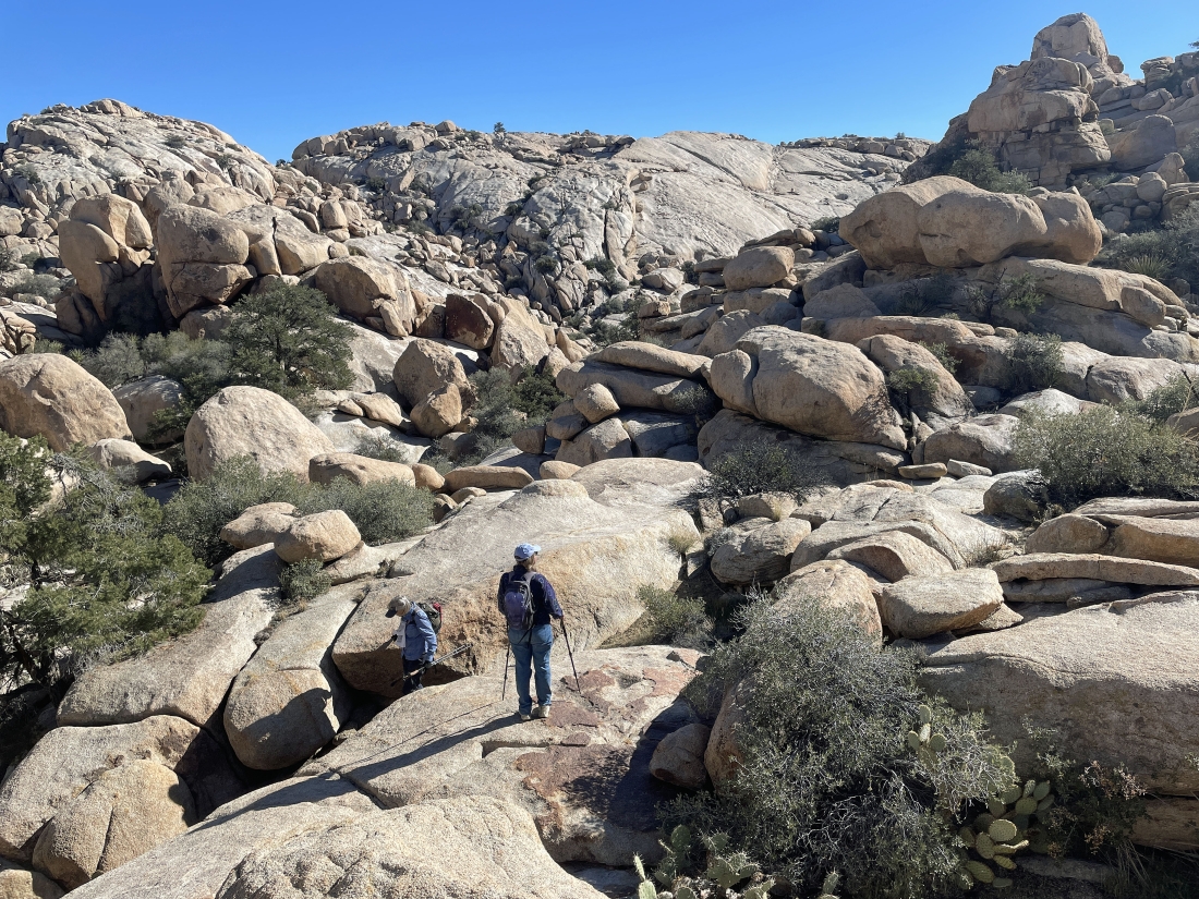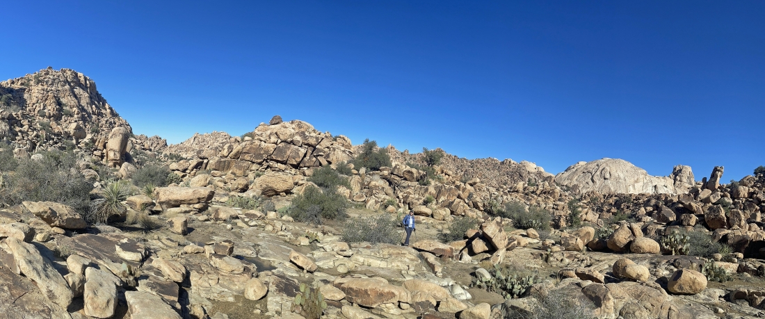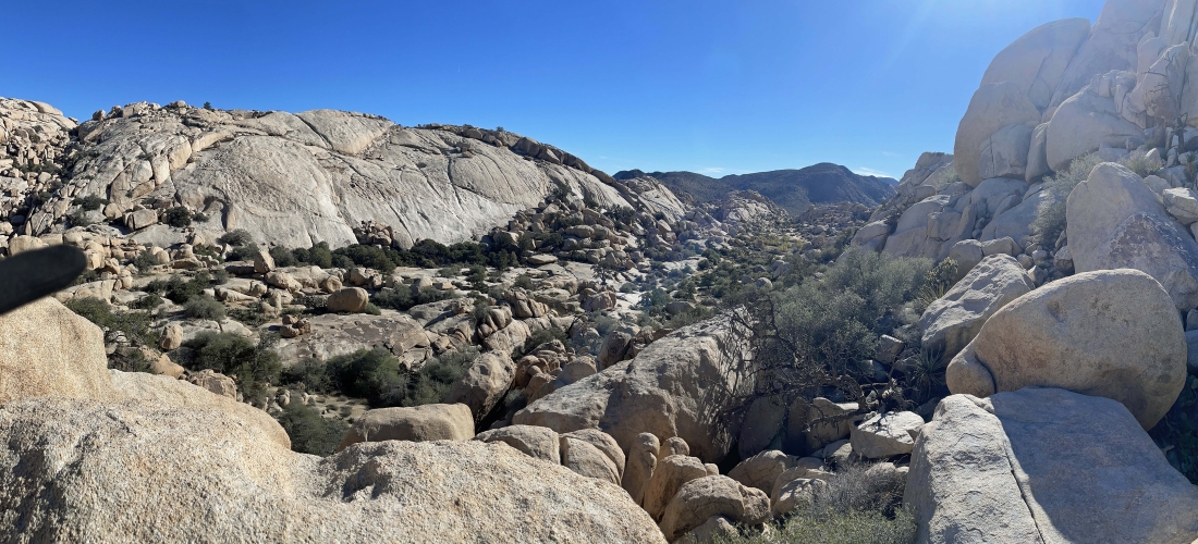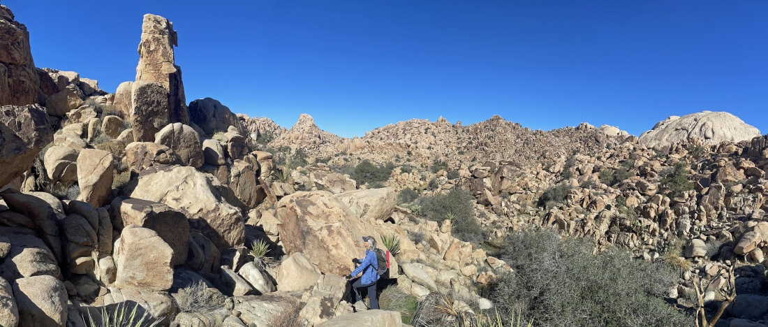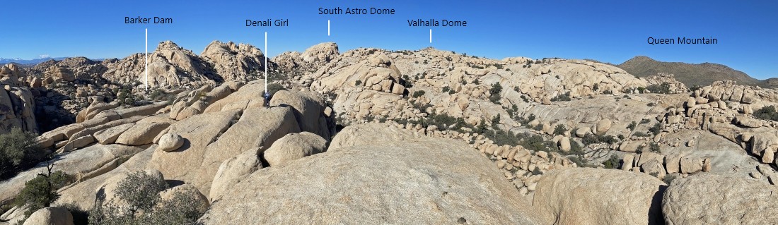 Looking back at the terrain we have covered on the Side Door route out of the Barker Dam area... we are going to take a little side trip up to the rock on the far left horizon before we head back to our car.