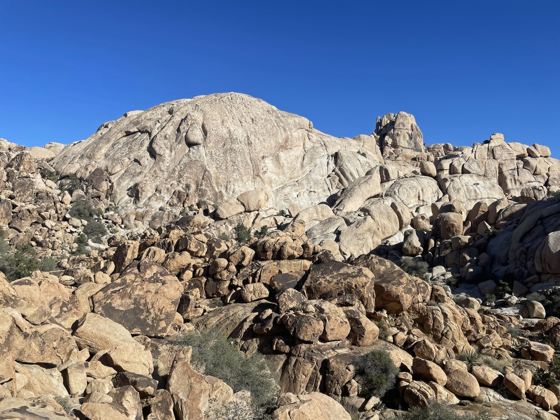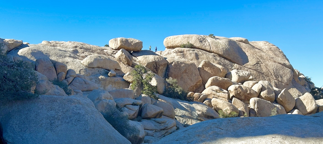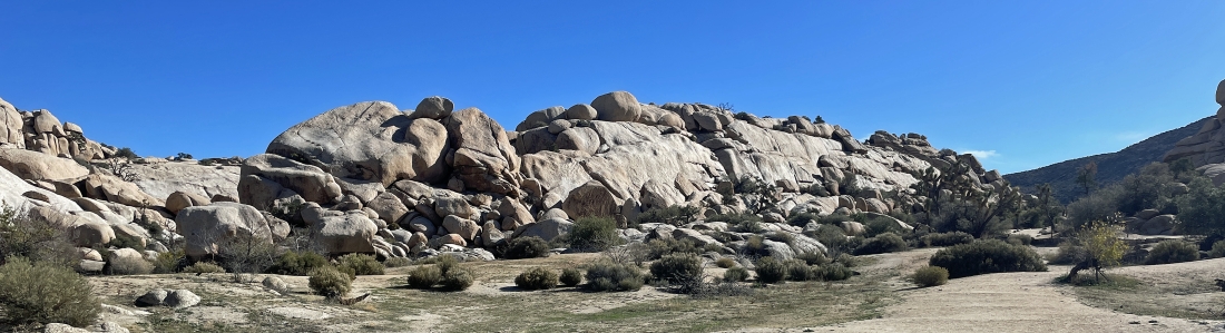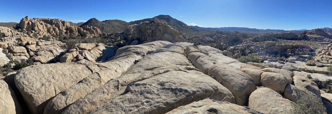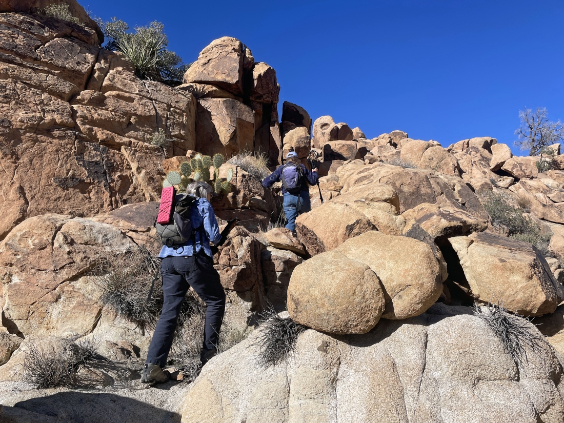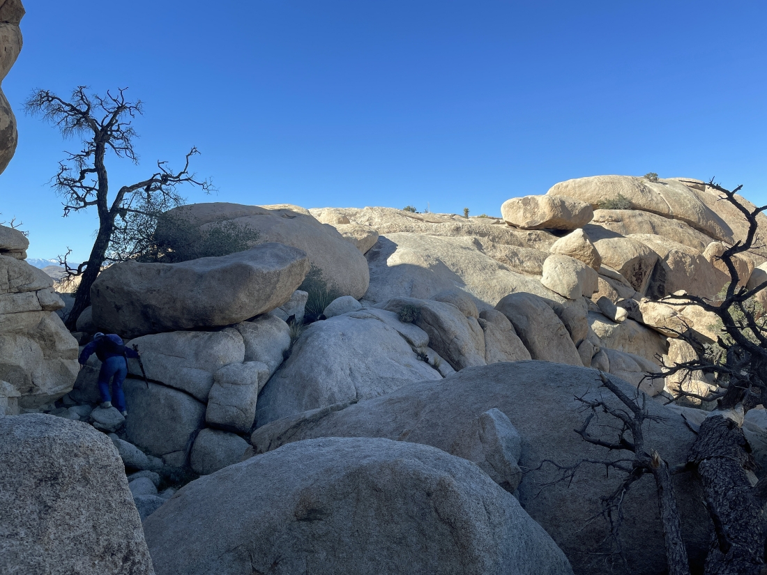 Looking back at the terrain we have covered on the Side Door route out of the Barker Dam area... we are going to take a little side trip up to the rock on the far left horizon before we head back to our car.
