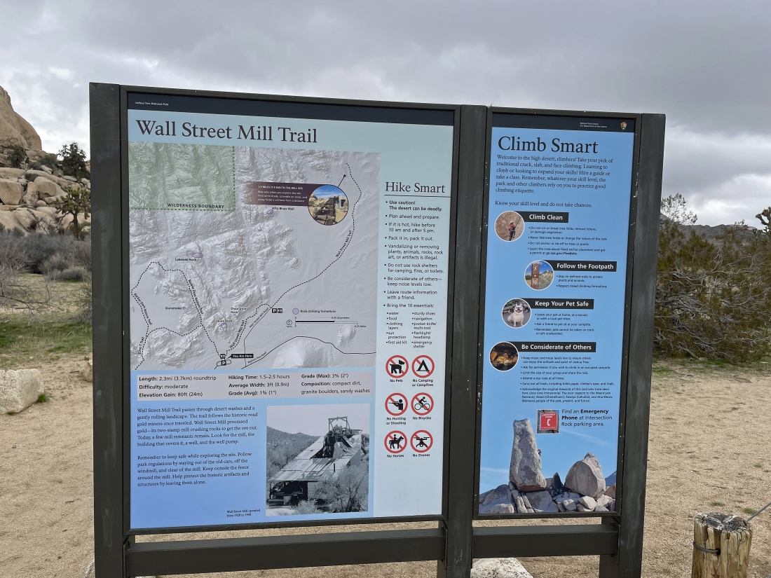 Just a bit of info here... this sign for the Wall Street Mill Trail is less than 50 feet away from the sign for the Barker Dam Nature Trail. In other words, the two hikes share the same paved parking lot.