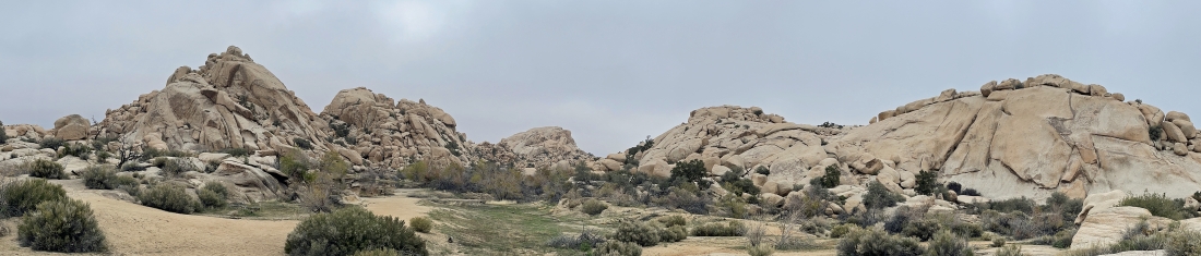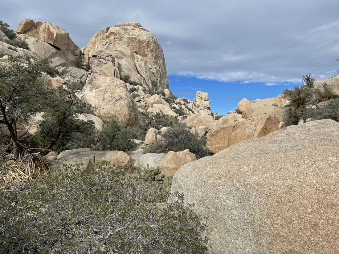 Hiking south in the Wonderland of Rocks as I look back at the South Astro Dome and North Astro Dome on the left... and The Camel on the far right.