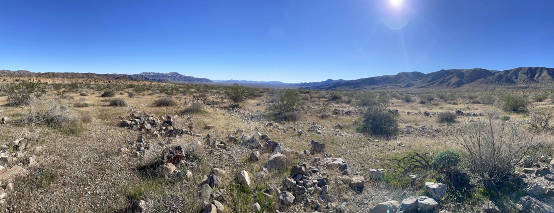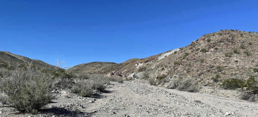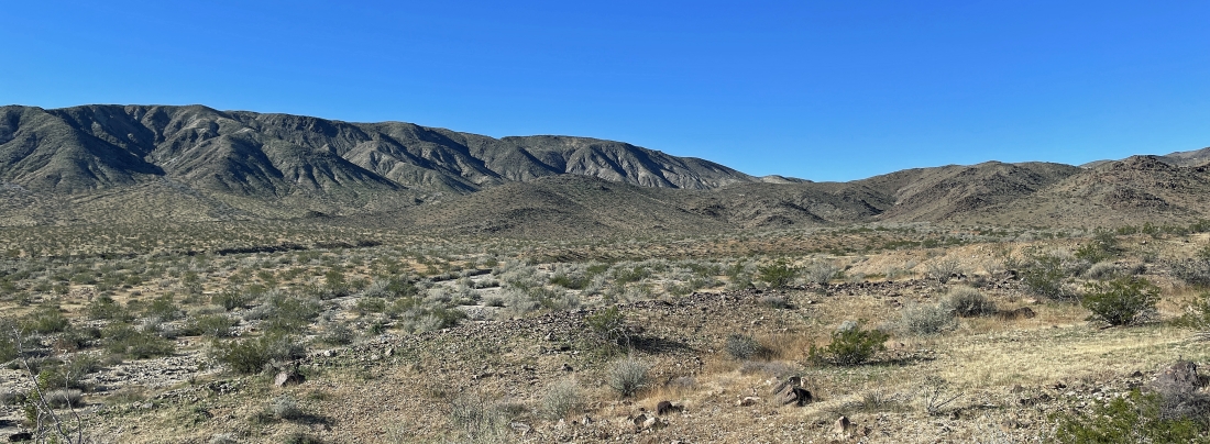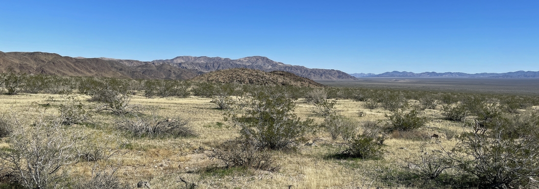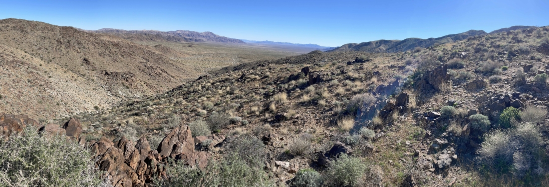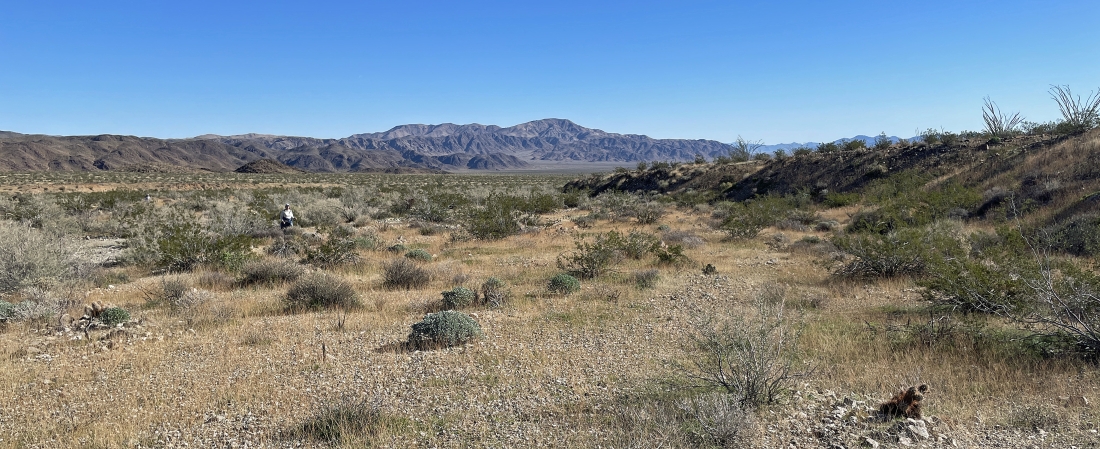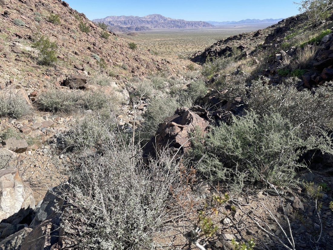 Out of the narrow canyon and back on easy terrain... heading toward Pinto Mountain on the left-center horizon.