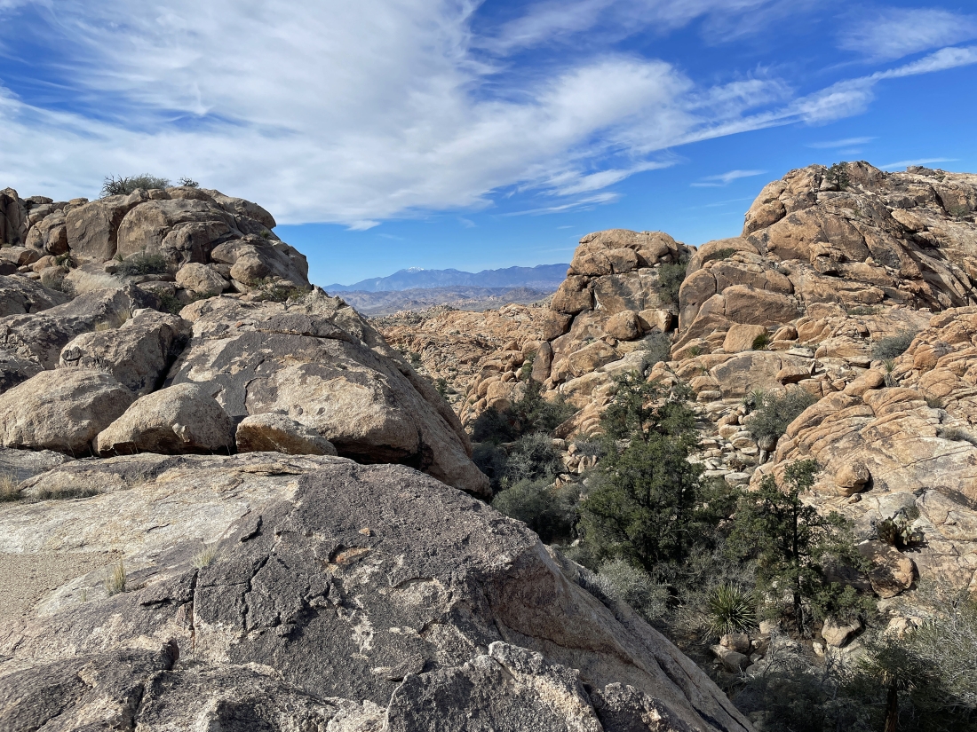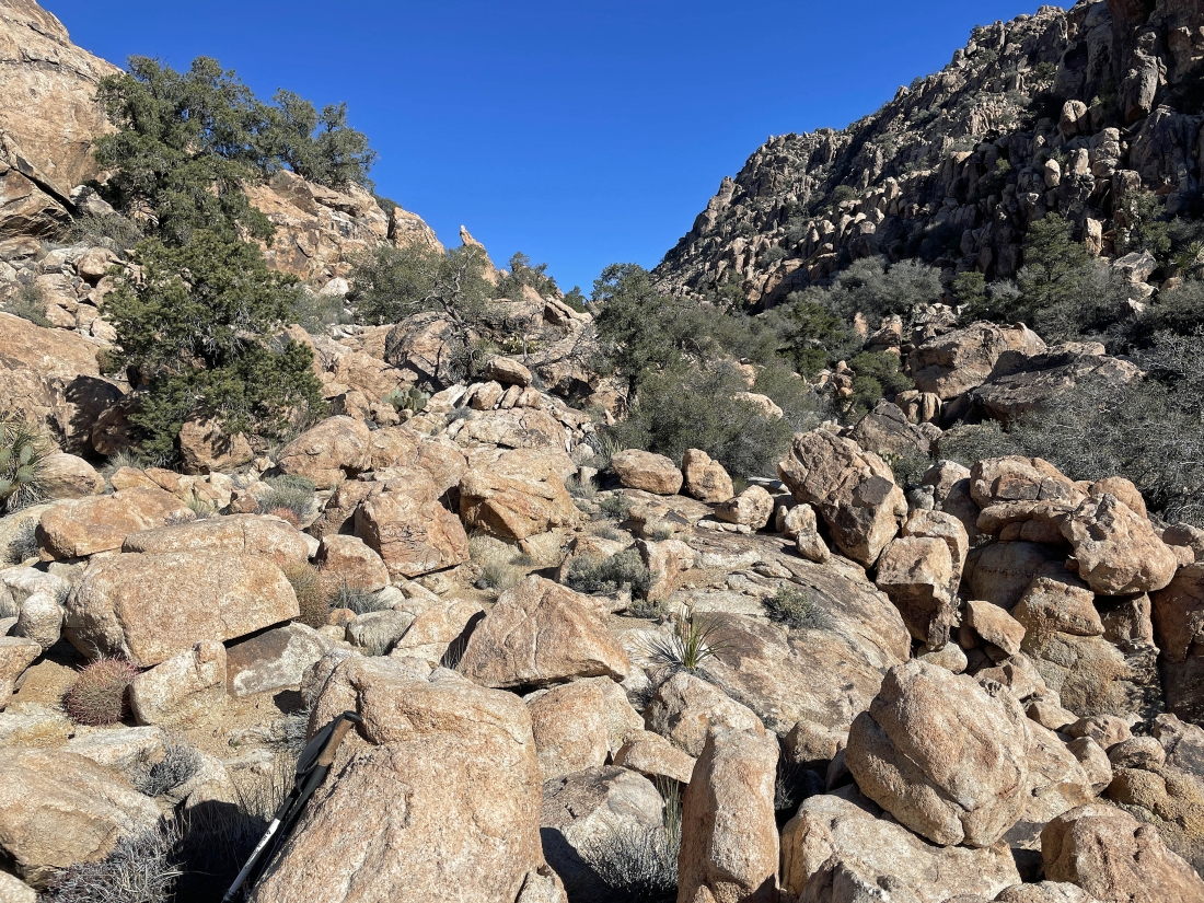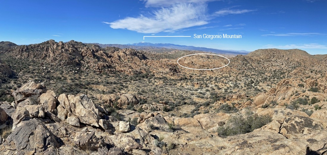 Looking west through this gully in the Tanzbotini area at San Gorgonio Mountain on the horizon.