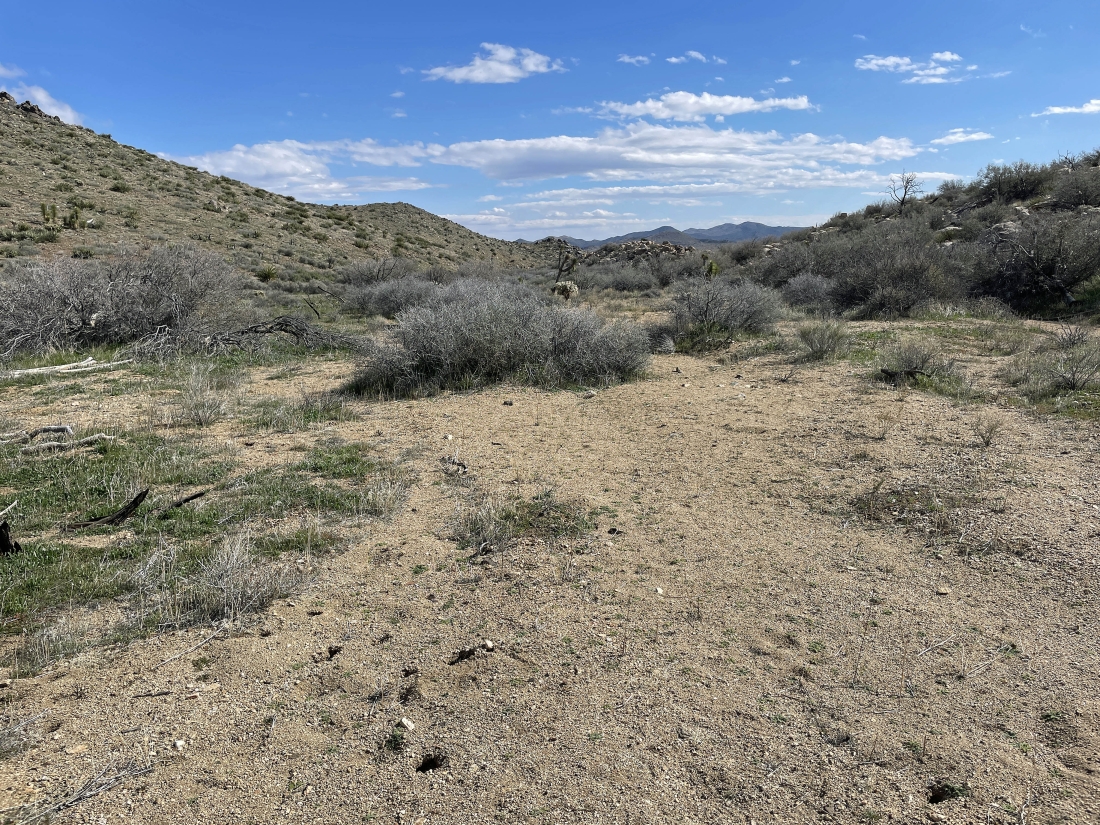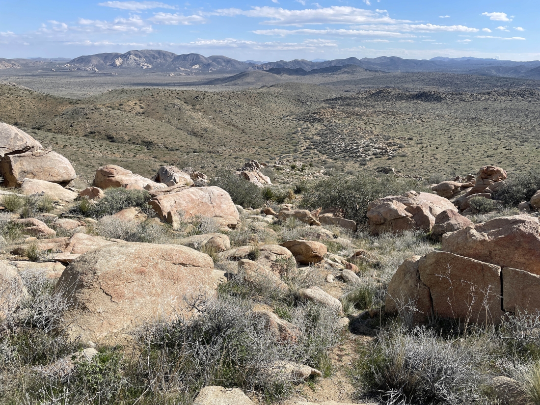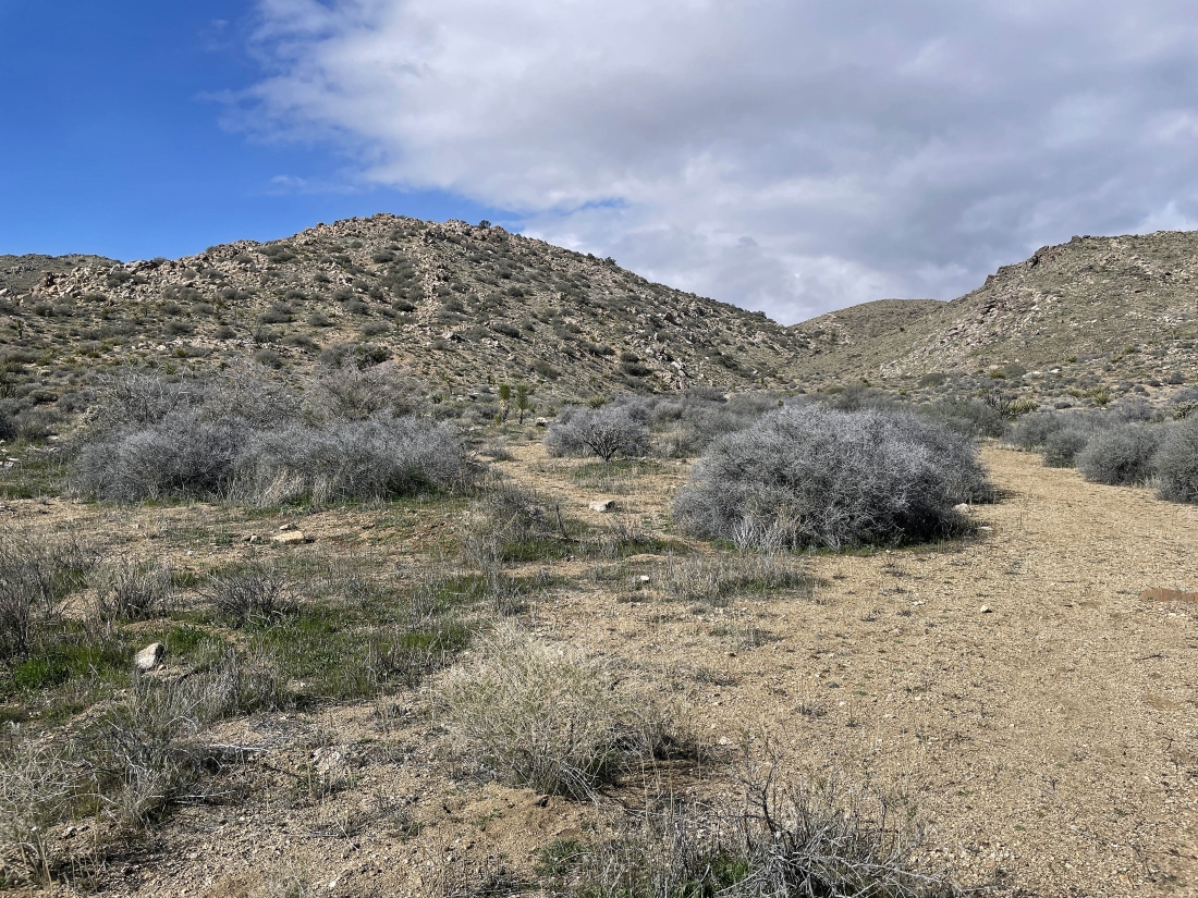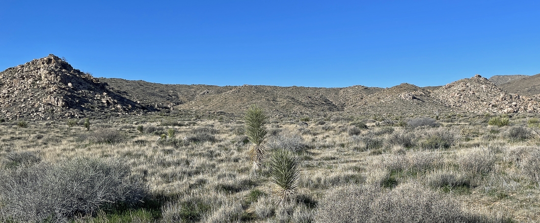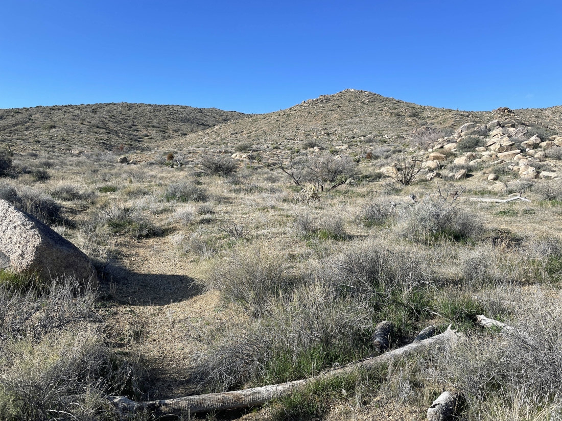Heading toward the ridge line just to the right of the bump in the left foreground. I can see Quail Mountain on the extreme far right horizon.