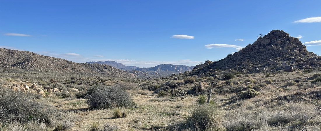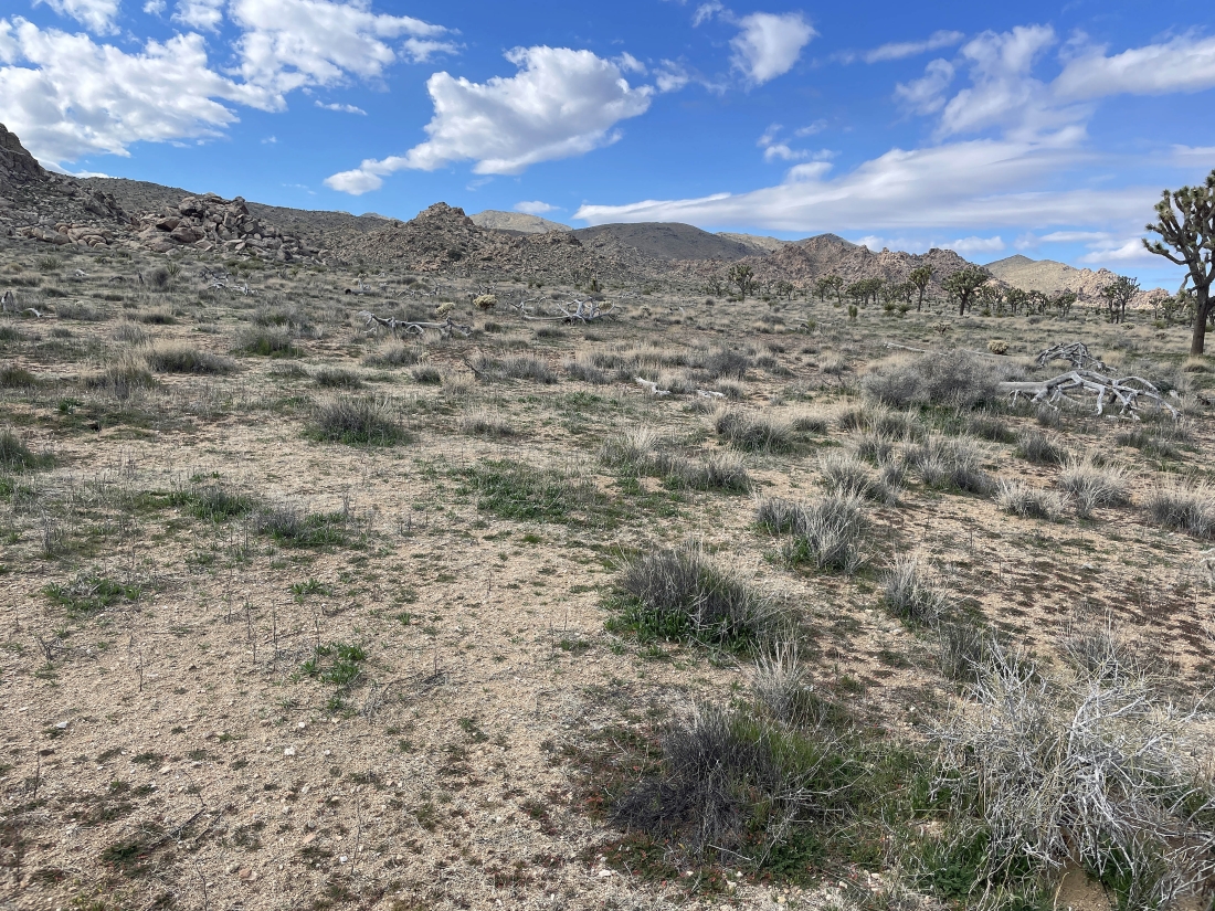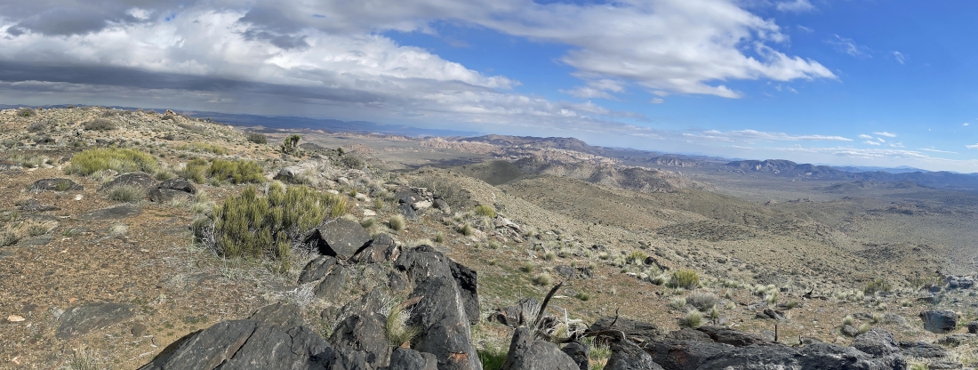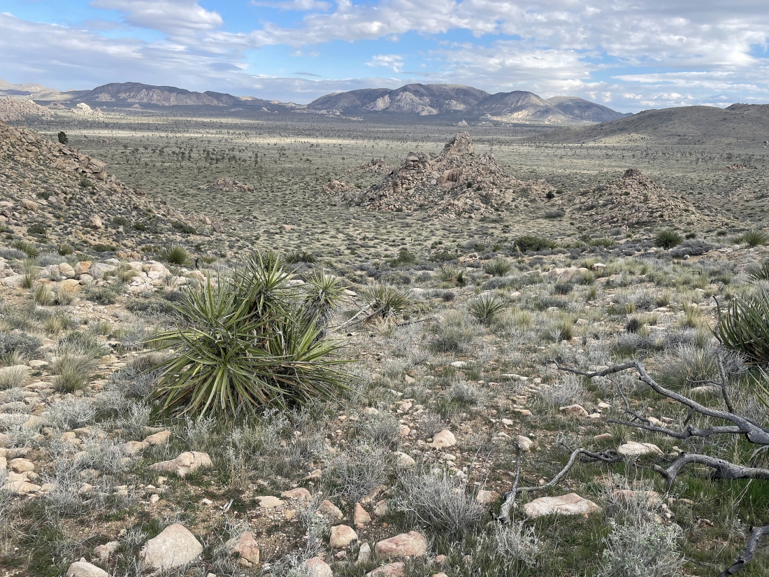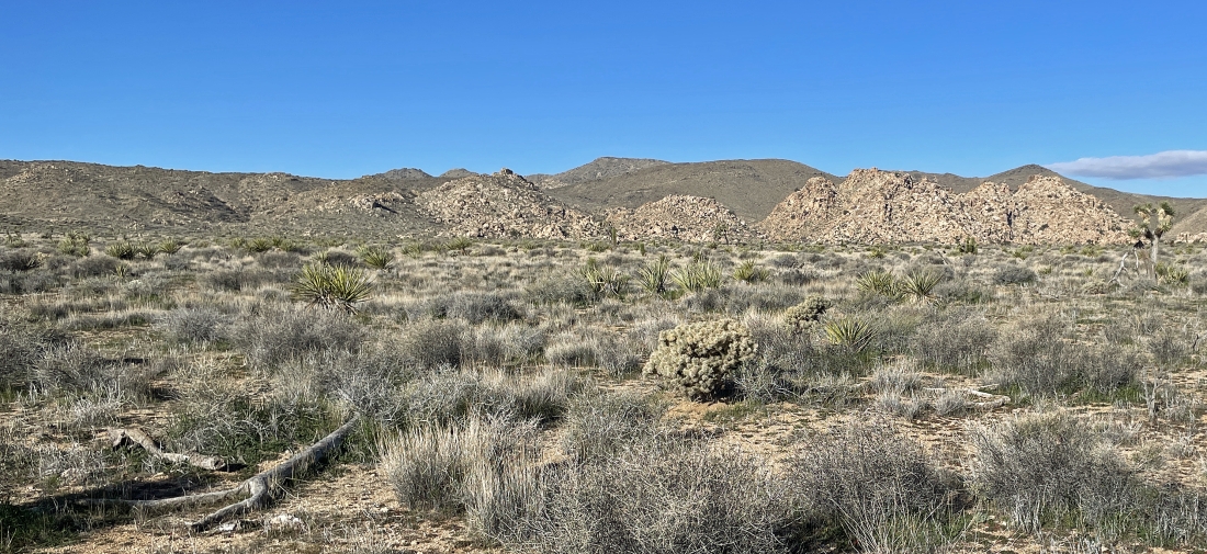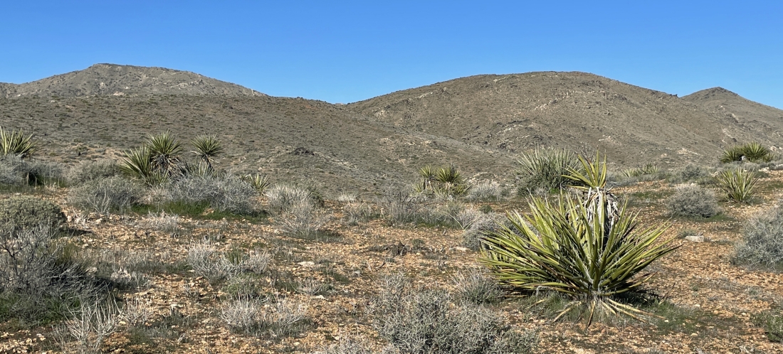 Heading toward the ridge line just to the right of the bump in the left foreground. I can see Quail Mountain on the extreme far right horizon.