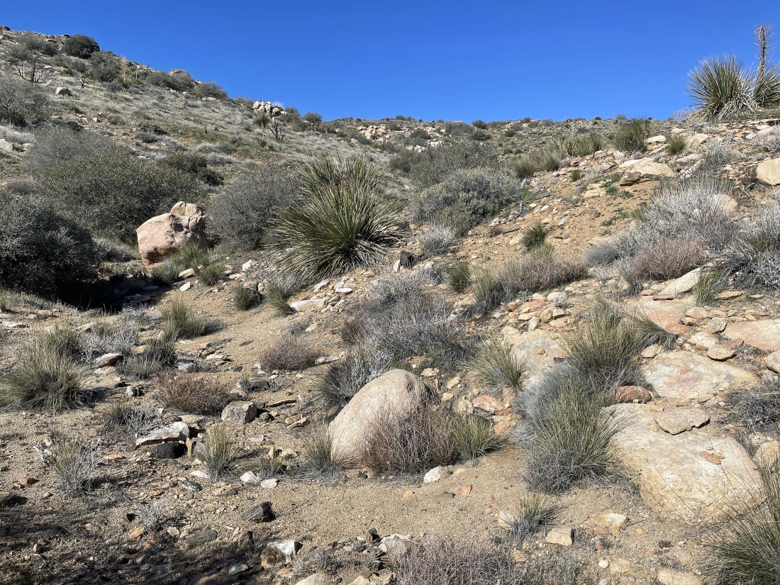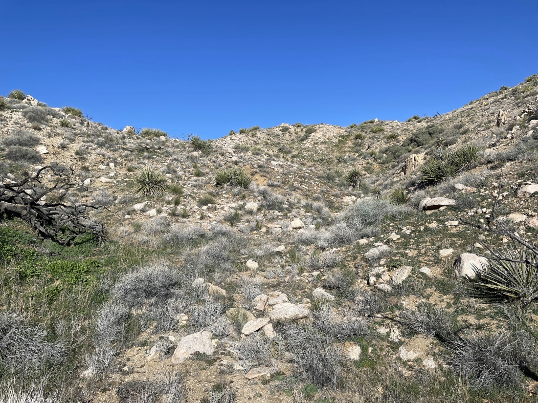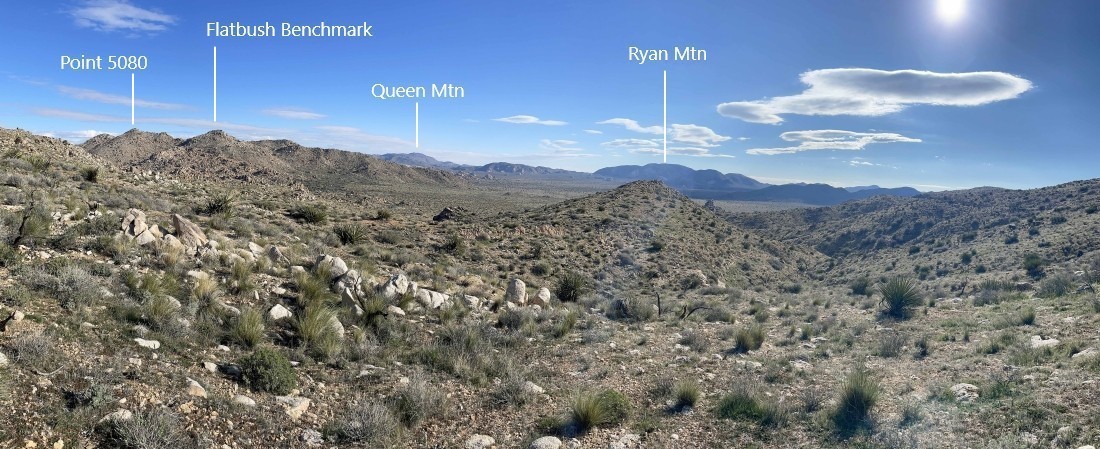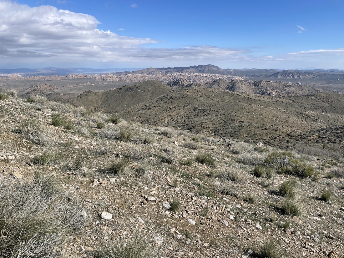 Almost at the ridge on the SE shoulder of Quail Mountain... here looking back at the gully I have just dealt with... with Ryan Mountain on the horizon in the middle of the photo.