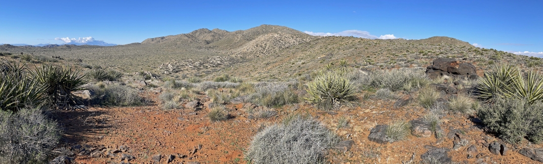 Continuing to hike SE in the wash... here looking back at the end of the SE ridge... with Quail Mountain beyond it on the left-center horizon.