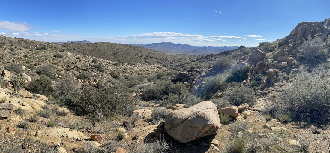 I have reached the ridge, but it looks like I will have to give up a little elevation before I can get up to Quail Mountain on the horizon in the middle of the photo. Out there on the far left horizon are the San Jacinto Mountains located above Palm Springs.