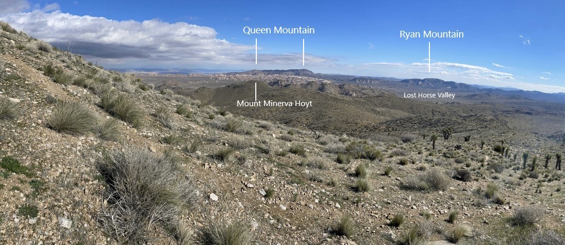 Nearing the ridge on the left... with Quail Mountain on the far left horizon... with Mount Minerva Hoyt on the far right horizon. In 1936 Minerva convinced President Franklin D. Roosevelt to make Joshua Tree a national monument... and it became a national park in 1994.