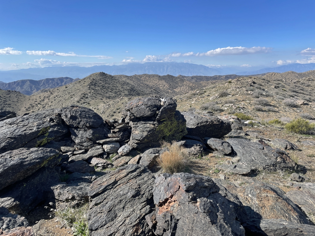 After hiking a total of 5.4 miles I have reached the 5,816 foot summit of Quail Mountain... the high point in Joshua Tree National Park... here looking SW beyond part of the Little San Bernardino Mountains in the foreground to the San Jacinto Mountains on the horizon in the middle of the photo... with part of the Santa Rosa Mountains on the far left horizon.