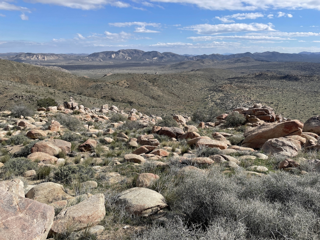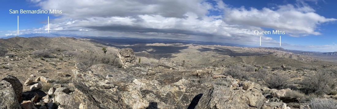 From the short distance north of the Quail Mountain summit I am looking NW to the cloud covered San Bernardino Mountains... and NE to Queen Mountain. A short distance from the park boundary are the towns of Joshua Tree and Twentynine Palms... with several valleys including Homestead, Surprise and Coyote.