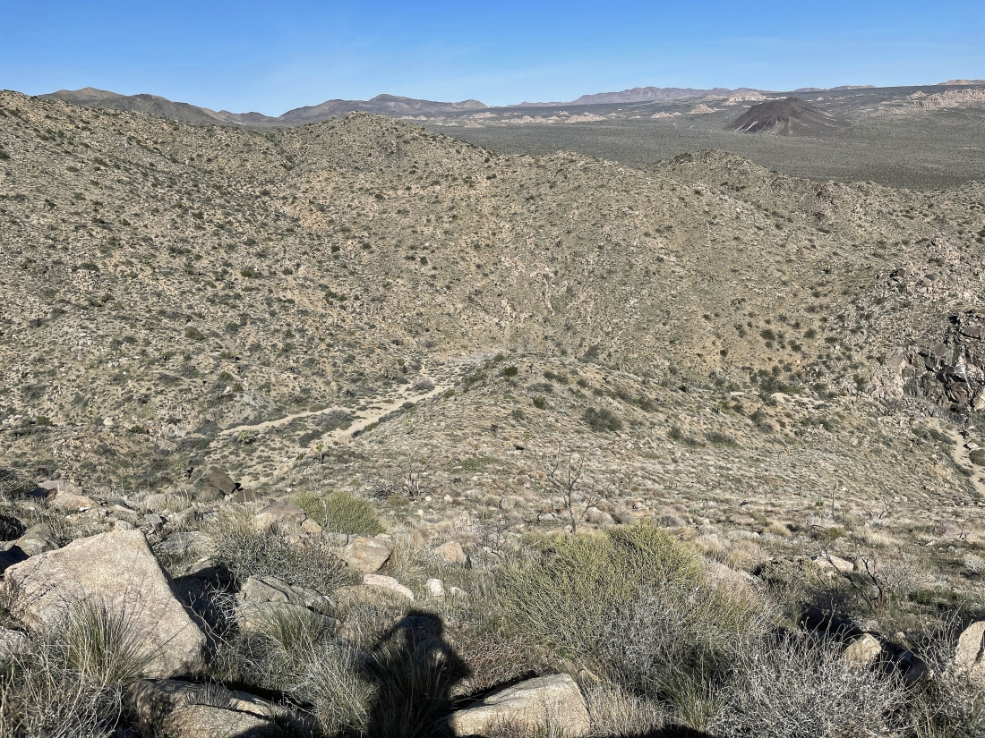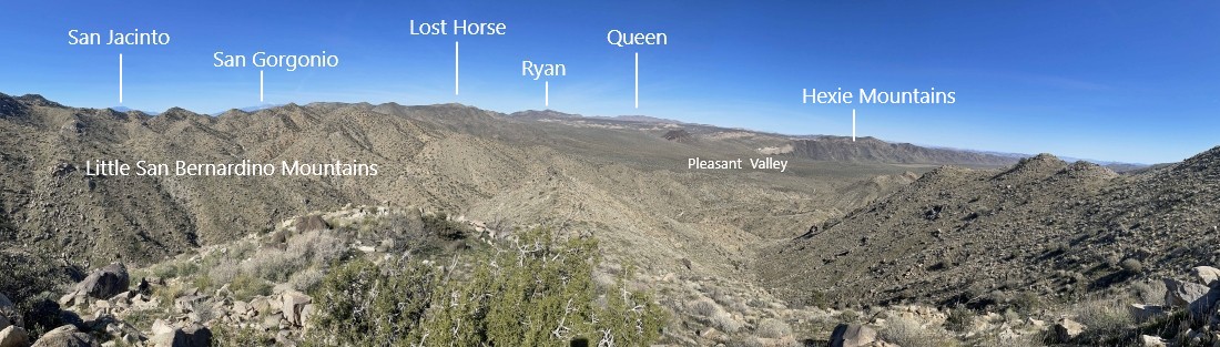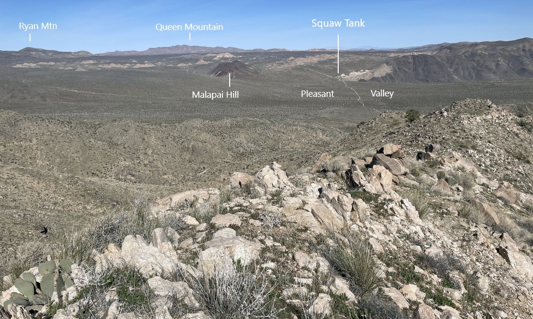 Continuing to go uphill... here looking down into Pushawalla Canyon... and looking north I can see Ryan Mountain and Queen Mountain on the horizon in the middle of the photo.