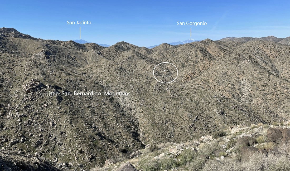 Looking west... with Pushawalla Canyon down below... and the white circle identifies 'Guzzler WT'.