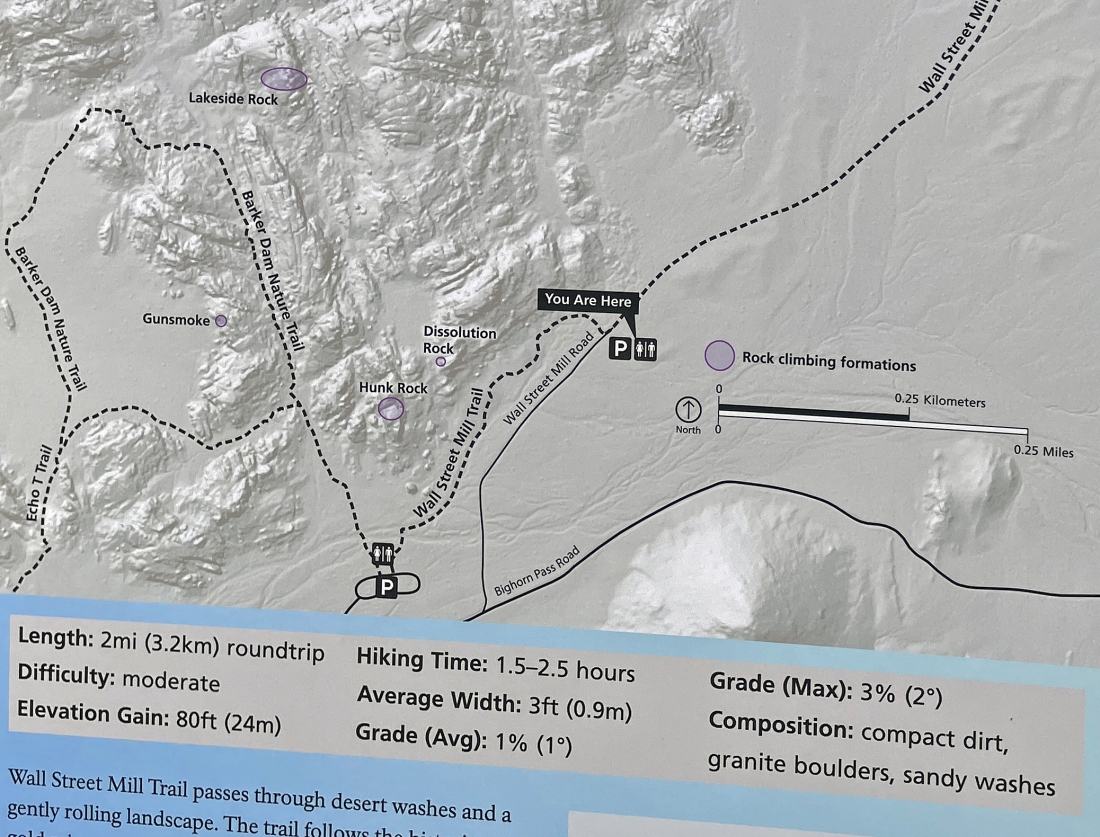 We parked at the dirt parking lot located a quarter mile NE of the popular paved parking lot for Barker Dam. From the dirt parking lot we will hike less than a quarter mile SW on the Wall Street Mill Trail and then take a 'side door' route into the Barker Dam area by going in between Hunk Rock and Dissolution Rock on the map in this photo.