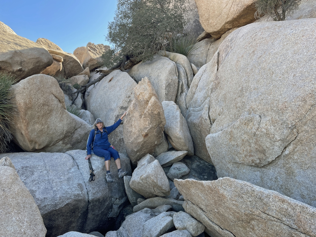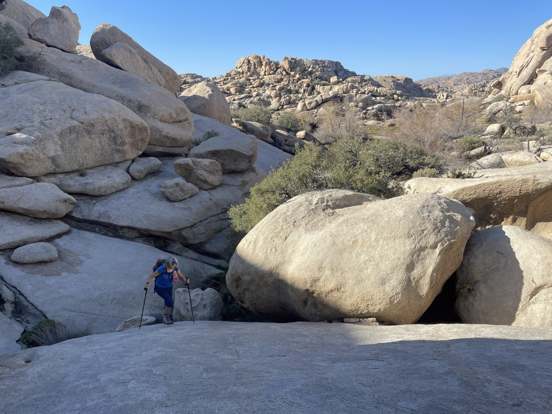 A stone's throw from the Barker Dam area Denali Girl is getting ready to head up to Valhalla Dome via the smooth rock behind her.