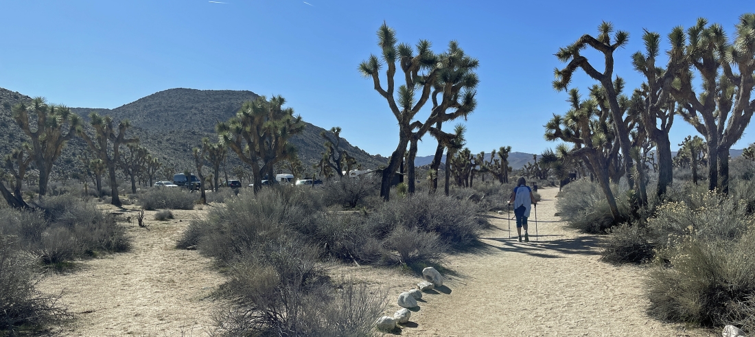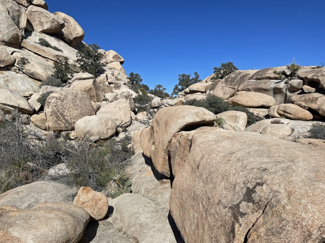 Hiking SW on the Wall Street Mill Trail toward the paved Barker Dam parking lot... but before getting to the Barker Dam Trail we will leave this trail out there in front of the huge smooth faced rock in the middle of the photo.