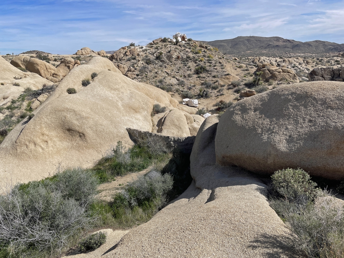 From Park Blvd in Joshua Tree National Park drive 2.2 miles south on Pinto Basin Road and park in the parking lot for Arch Rock... and looking west from the parking lot notice how the terrain looks like it will be flat.