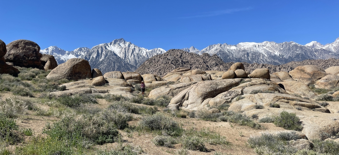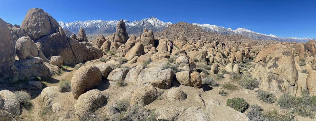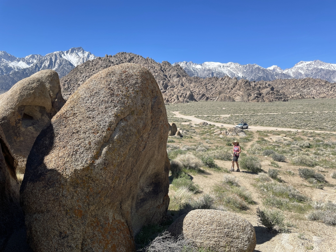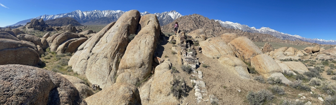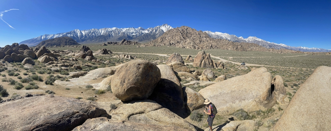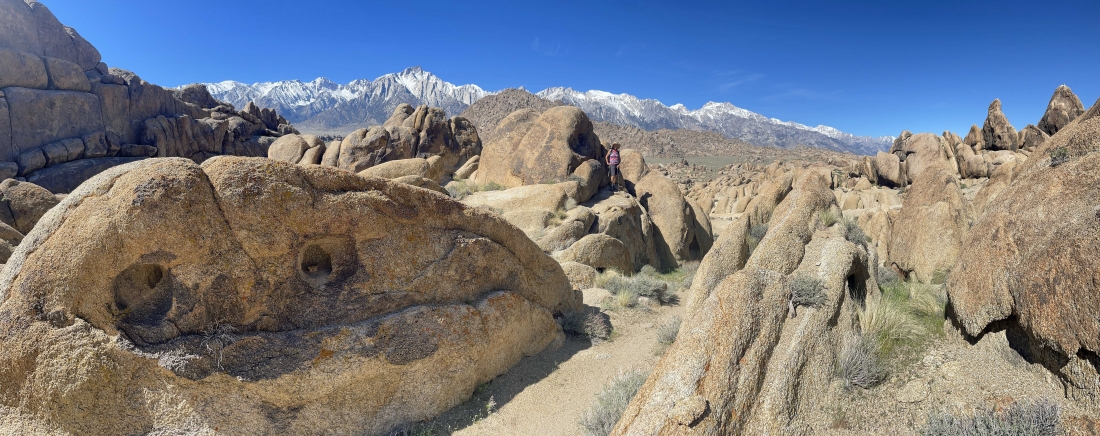 We are hiking east from where we parked and looking back to the west at the snow covered Sierra Nevada Mountains. Movie Road is running left-to-right through the middle of the photo. Parts of more than 400 movies have been filmed in the Alabama Hills.