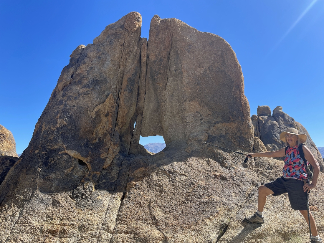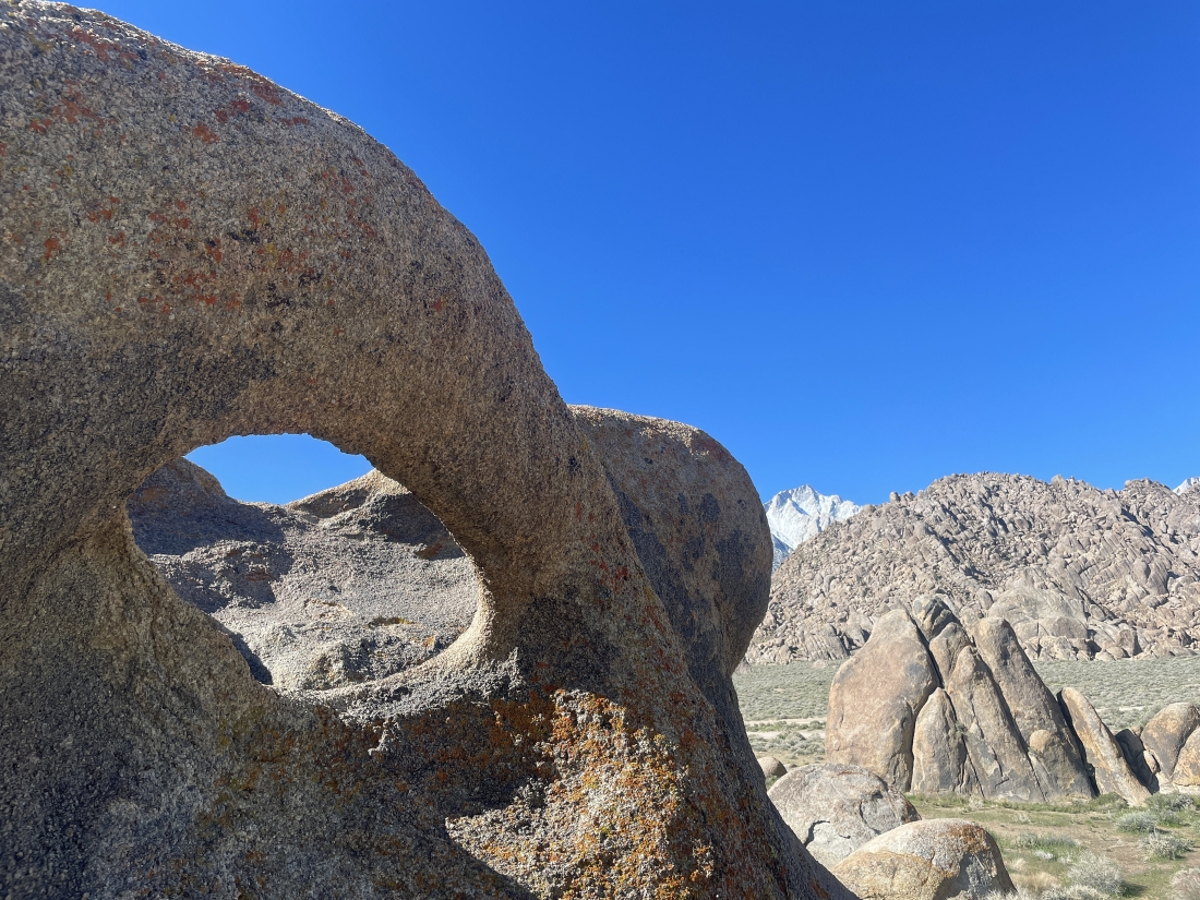 A hole in this rock with part of the Inyo Mountains in the distance on the other side of the hole.