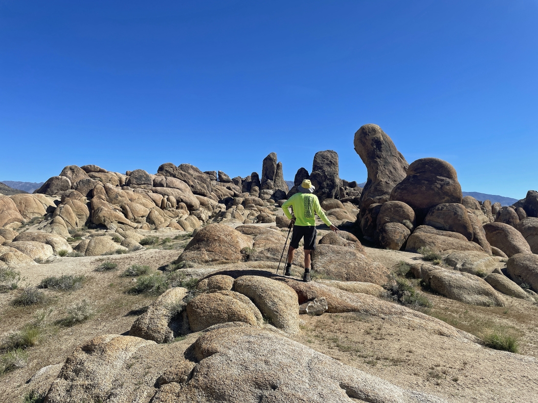 Looking back to the west as we continue hiking east. Mt. Whitney is blocked by the huge pile of rocks and boulders in the distance beyond Denali Girl.