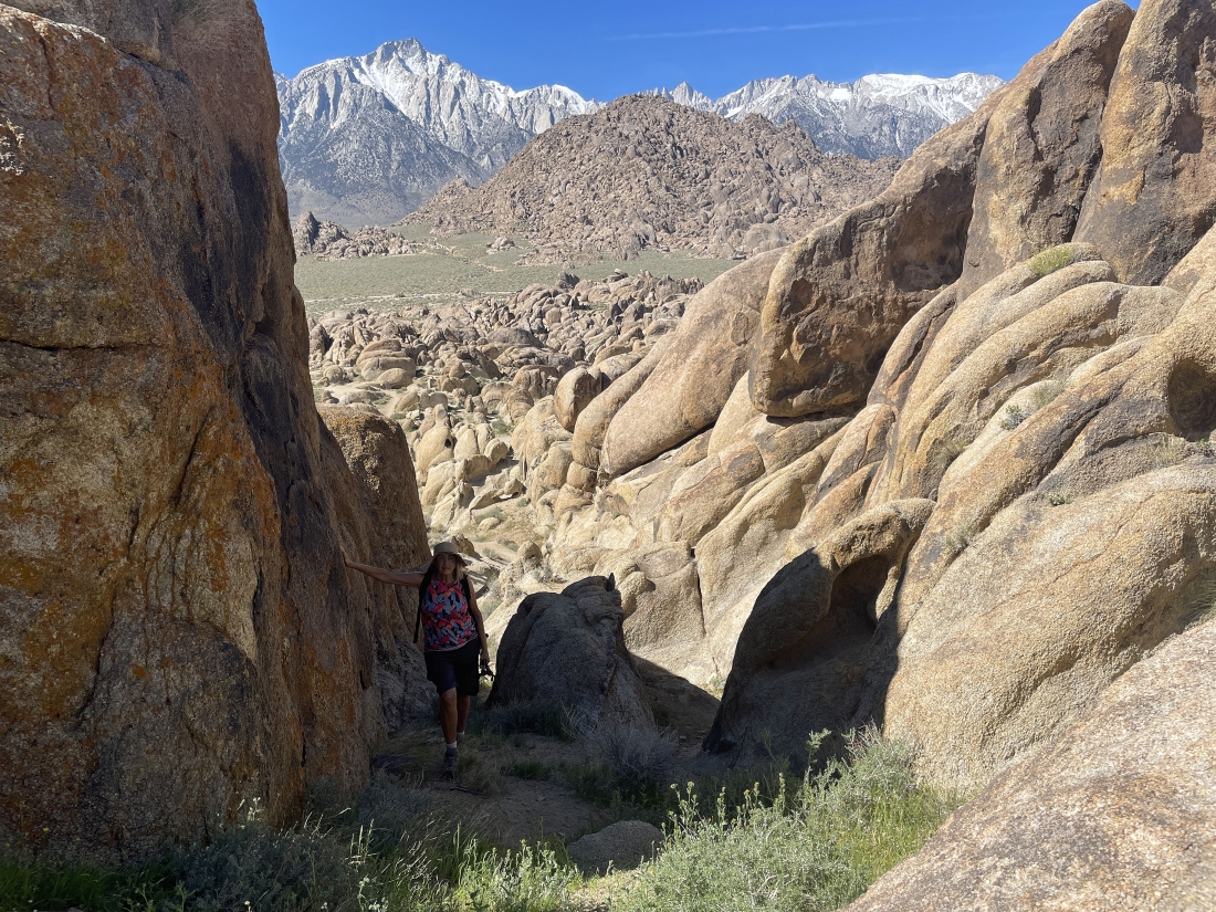 I have reached the 4,690 foot summit as I watch Denali Girl work her way up to join me... looking out to the northern section of the Alabama Hills... with part of the Sierra Nevada Mountains on the left horizon.