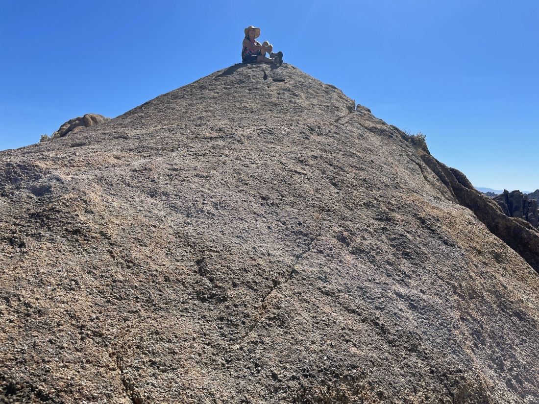 Denali Girl relaxes on our 4,690 foot summit... and we can see the pyramidal shaped Mt. Whitney on the far right horizon.